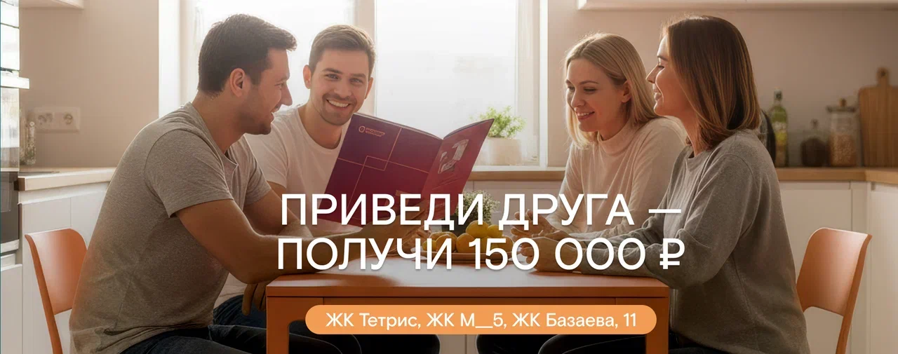 ГК «Садовое кольцо» дарит 150 тысяч рублей за рекомендацию покупки квартиры в одном из подмосковных ЖК компании — «Тетрис», «М_5» или «Базаева, 11».
