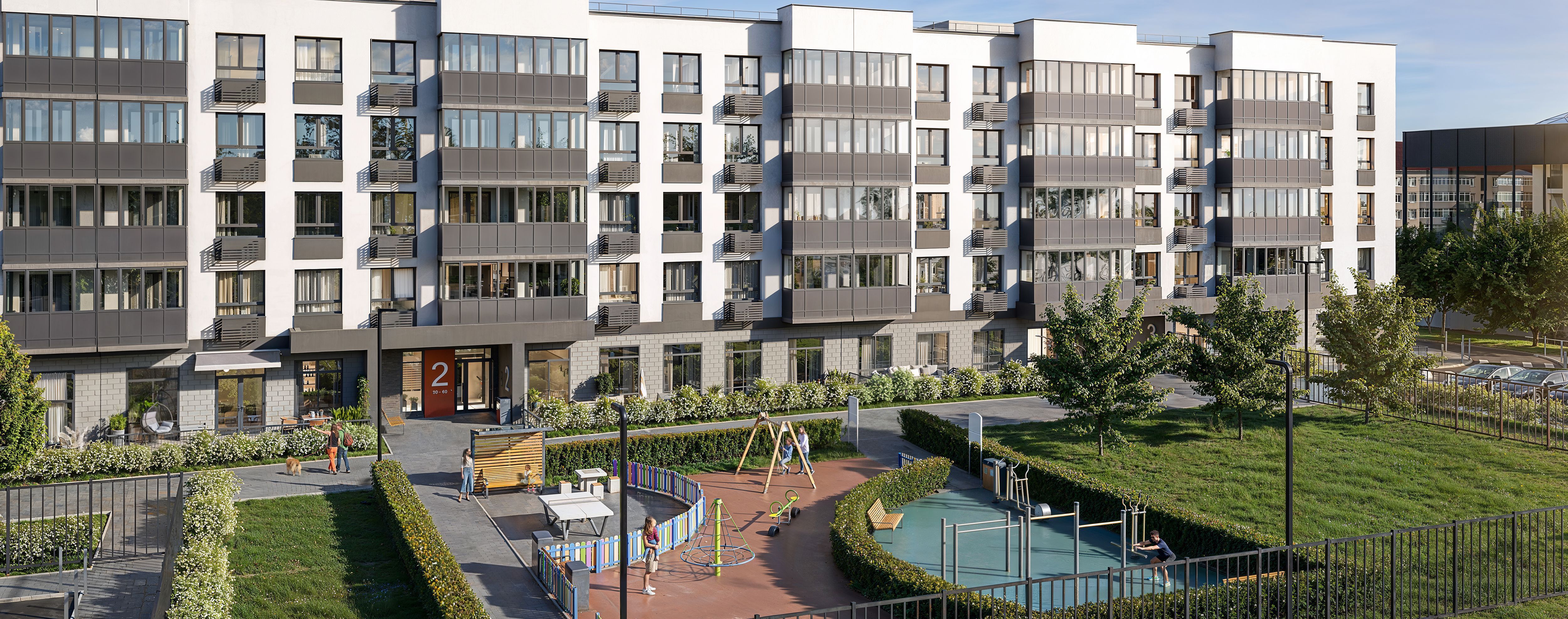 Рядом с домом будет располагаться детская площадка, оснащенная песочницами, канатными комплексами и зонами для подвижных игр. Тем, кто ведет активный образ жизни, понравится спортивная зона со столом для настольного тенниса, турниками, тренажерами и гимнастическими снарядами.